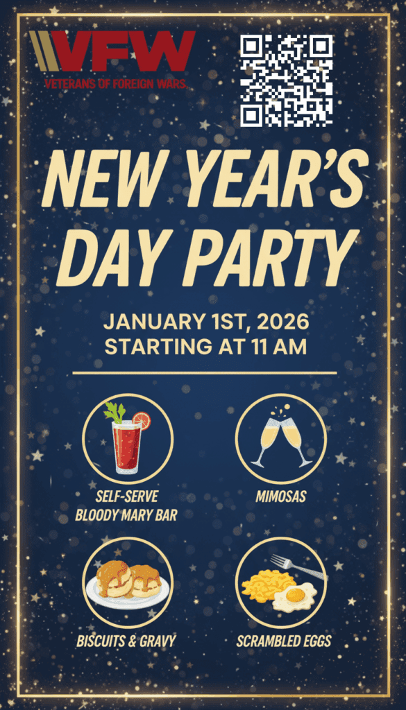 Celebrate the New Year in style by joining us at the VFW for a festive and fun-filled New Year’s Day Party! Kick off 2026 with a delicious self-serve Bloody Mary bar, refreshing mimosas, and hearty breakfast favorites like biscuits and gravy, along with scrambled eggs. It’s the perfect way to gather with friends and family, enjoy great food, and start the year on a positive note in a warm and welcoming environment. The VFW is more than just a social spot; it’s a vital organization that supports our veterans through numerous programs and initiatives. Your attendance not only guarantees a good time but also directly contributes to funding these important services.